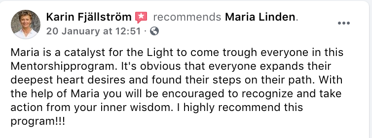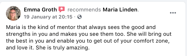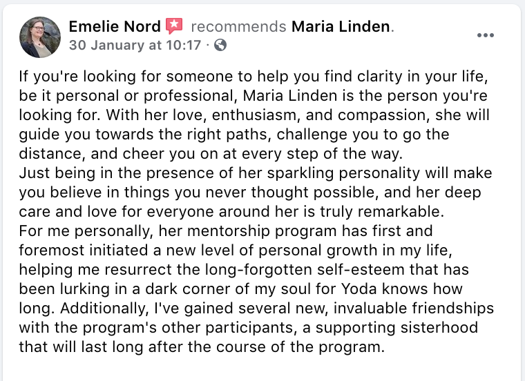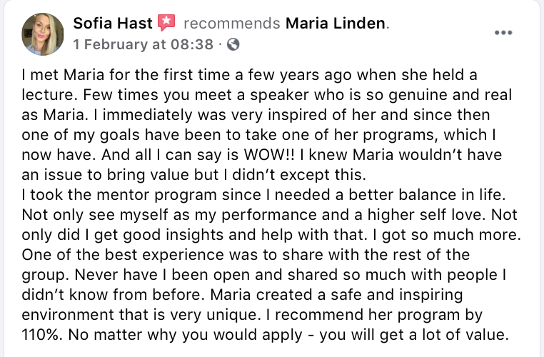 "Det här programmet har gett mig verktyg för hur jag kan fokusera och prioritera samt hantera min prestationsångest. Jag kan varmt rekommendera det här programmet till alla drivna kvinnor som har en eller flera utmaningar, för du kommer att få fantastiska verktyg som hjälper dig att hantera situationer med lätthet."